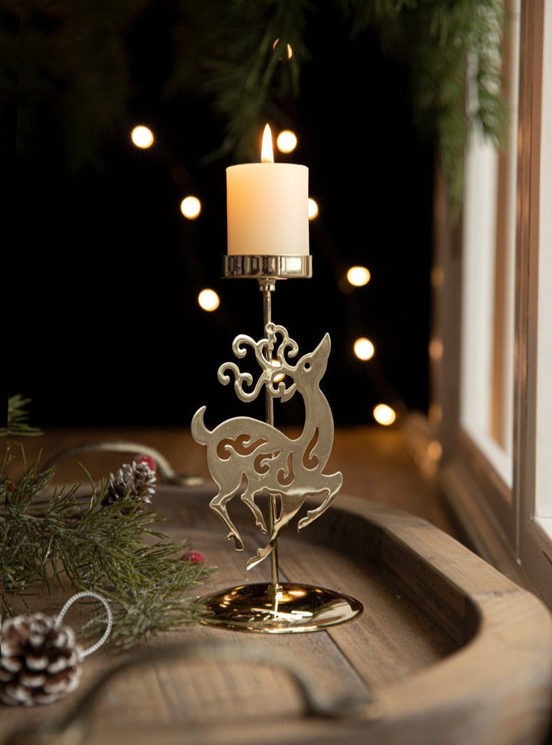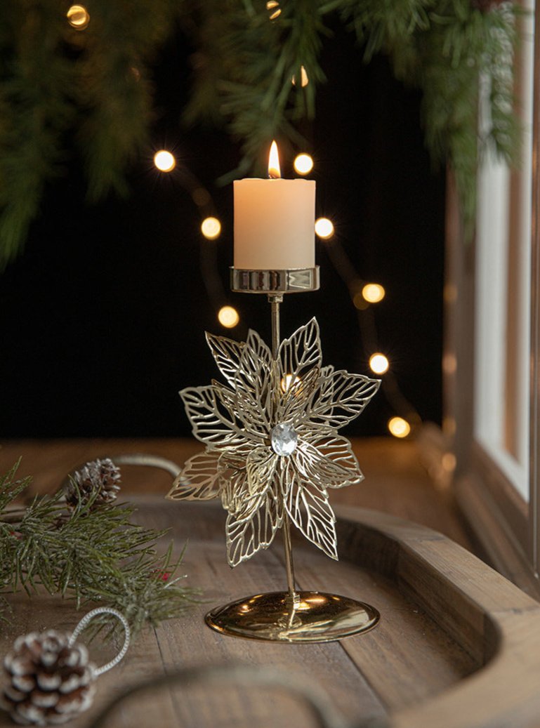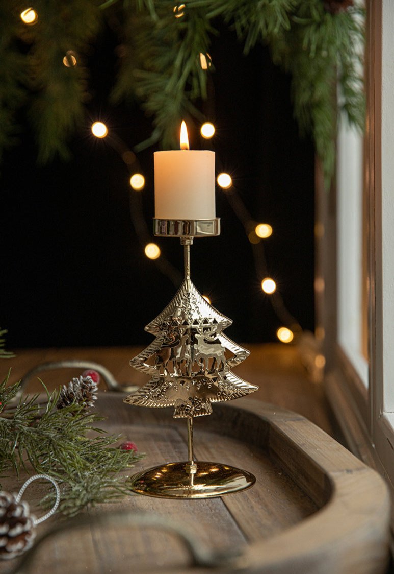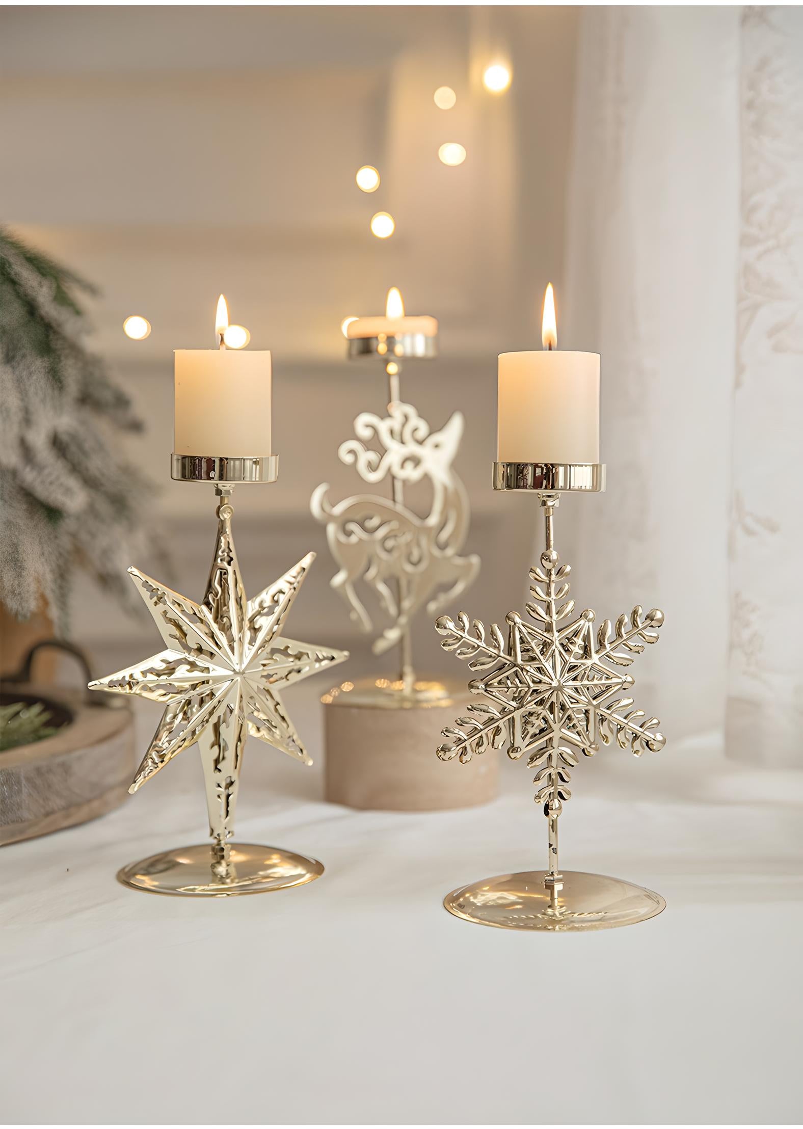 Diese Festtagskerzenständer in strahlendem Gold sind die perfekte Ergänzung für Ihre weihnachtliche Dekoration. Erhältlich in sechs bezaubernden Motiven – Rentier, Schneeflocke, Weihnachtsstern, klassischer Stern, Weihnachtsbaum und Weihnachtsblüte – bringt er den Zauber der Festtage auf Ihren Tisch.