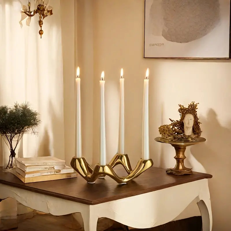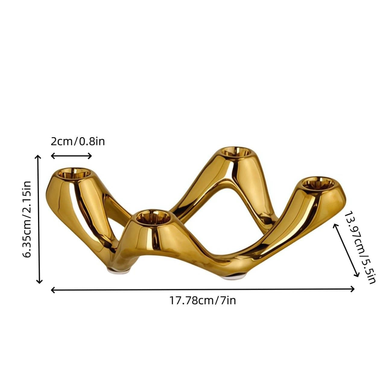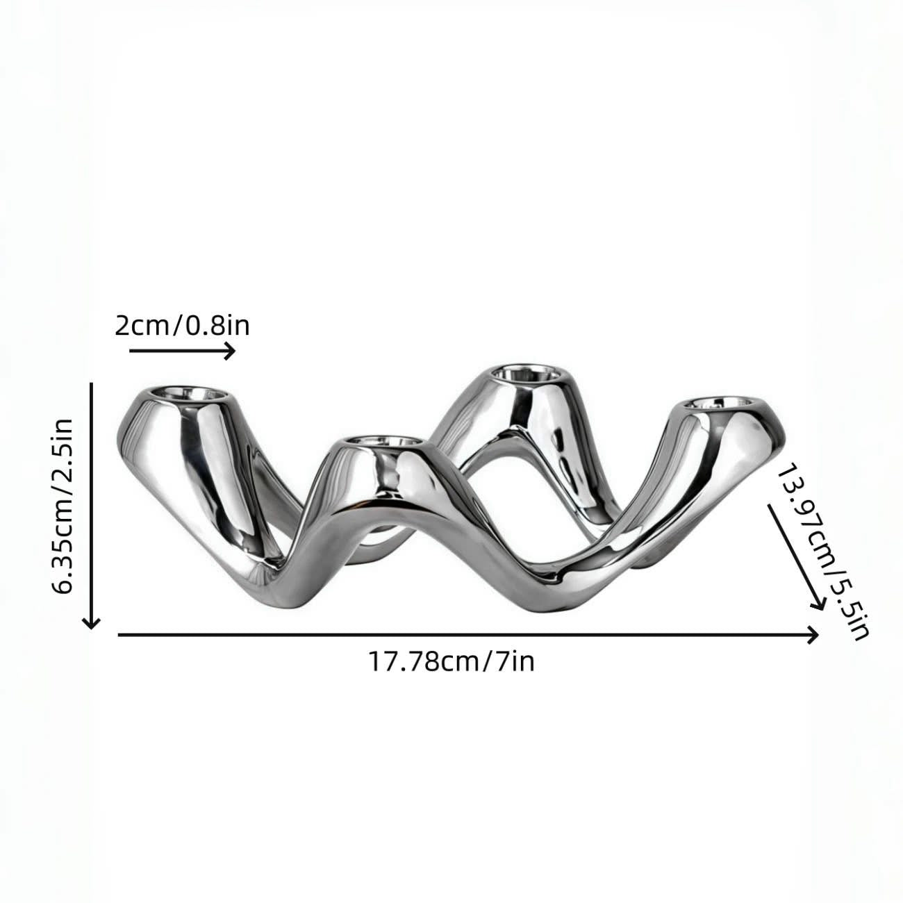 Sein handgefertigtes, geschwungenes Design aus hochwertiger Keramik bietet Platz für vier Stabkerzen und sorgt für ein warmes, weiches Licht – perfekt für Dinner-Abende, entspannte Stunden oder als stilvolles Wohnaccessoire im Alltag. Erhältlich in Silber und Gold für stilvolle Momente.